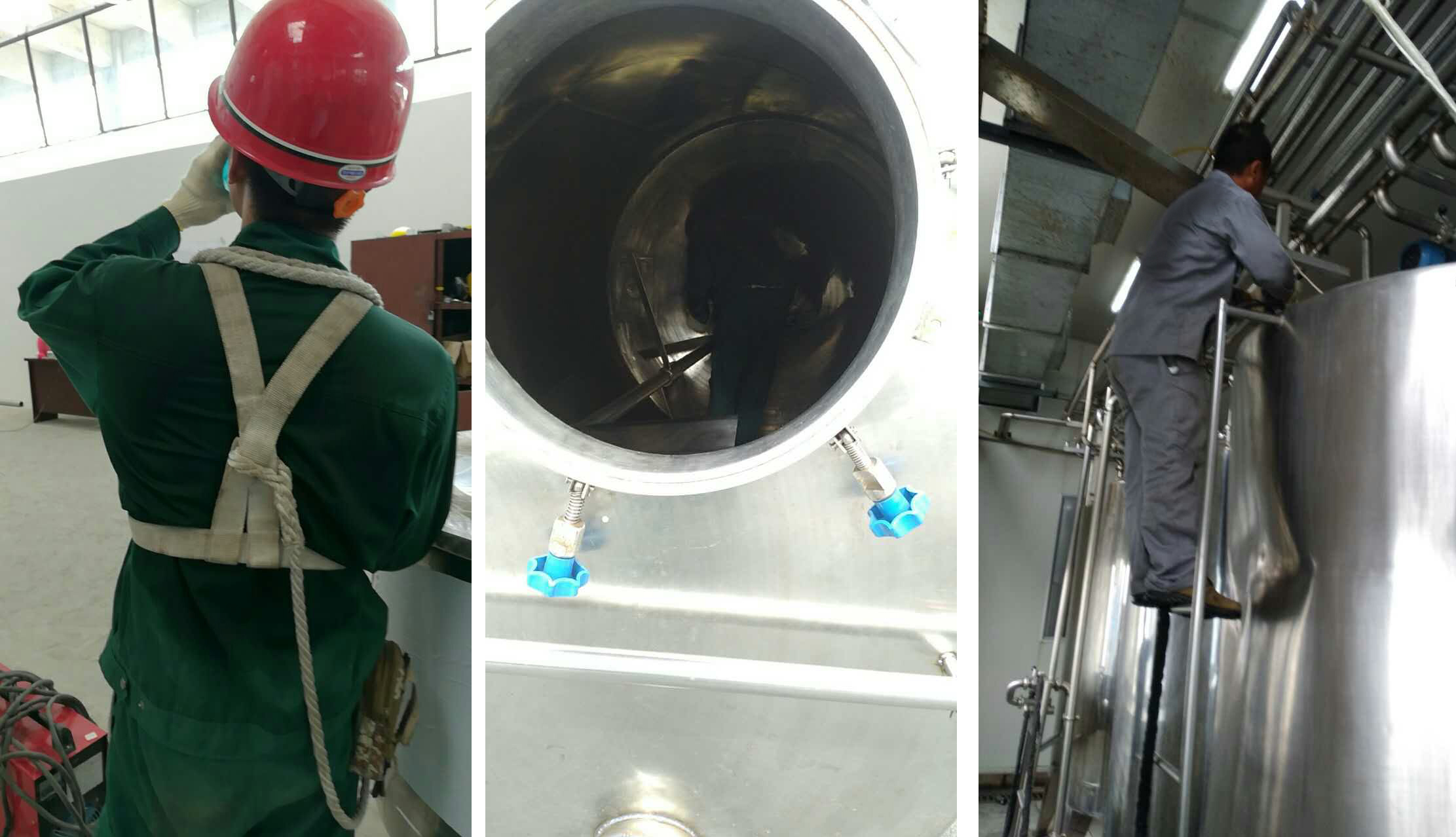 高溫下的不銹鋼表面就像是燒熱的烤板,碰在上面,就是強烈的燒灼感;在通風條件差的罐內(nèi)溫度明顯比罐外又要高出幾度。汗水浸濕了衣衫,手上的工作仍在繼續(xù),因為,按時交貨、如期完工,是我們的承諾。