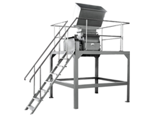工作時電機經(jīng)一對皮帶輪等速驅(qū)動主軸旋轉(zhuǎn),主軸上裝有飛刀高速旋轉(zhuǎn)。物料由升運機上自由落入進料斗中,被高速旋轉(zhuǎn)的飛刀切碎,由于離心力的作用,物料由腰形孔的篩網(wǎng)落入另置的儲槽中,然后由輸料泵泵入下道工序。